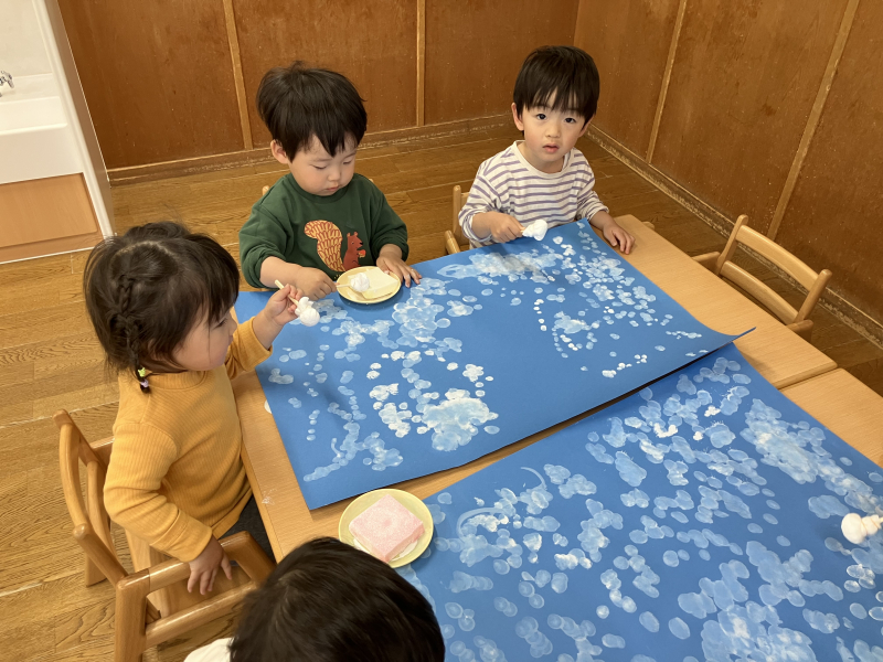 お正月の製作で“凧揚げ”を行いました。ビニール袋にペンで好きな絵を描き、可愛らしい凧が完成!公園で揚げてみると高く揚がり子ども達も大喜びでした。ちらちらと自分の凧が高く揚がっていることを見ながら楽しむちゅうりっぷ組さんです!