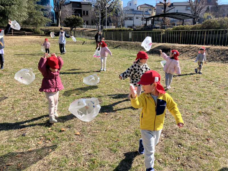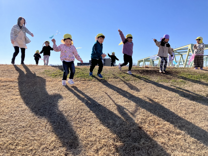 お正月遊びとして、年始に荒川土手へ凧揚げをしに行きました。すみれ組さんと一緒に、各クラスで製作した凧を持って出発!傾斜のある場所へ移動すると、上から下の方へ思い切り走っていく子どもたち。風を受けてフワフワと浮く凧を見て大喜びでした。「誰が高く揚げられるかな~」とお友だちとやりとりをしたり、一緒に走って楽しんだりしていました。