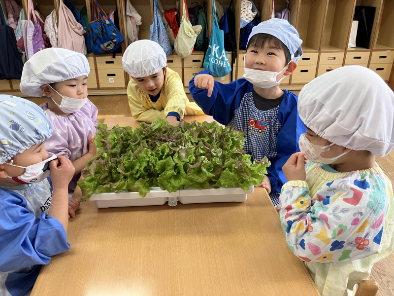 ちゅうりっぷ組のみんなと水耕栽培でサニーレタスを育てました。毎日、サニーレタスを見て「大きくなってる!」と喜んでいた子どもたち。クッキングで収穫して自分たちでサニーレタスを洗い、食べてみると「甘い!」「苦い!」「葉っぱの味がする」と感想は様々…。園長先生や他のクラスのお友だちにもお裾分けして嬉しそうな様子でした。