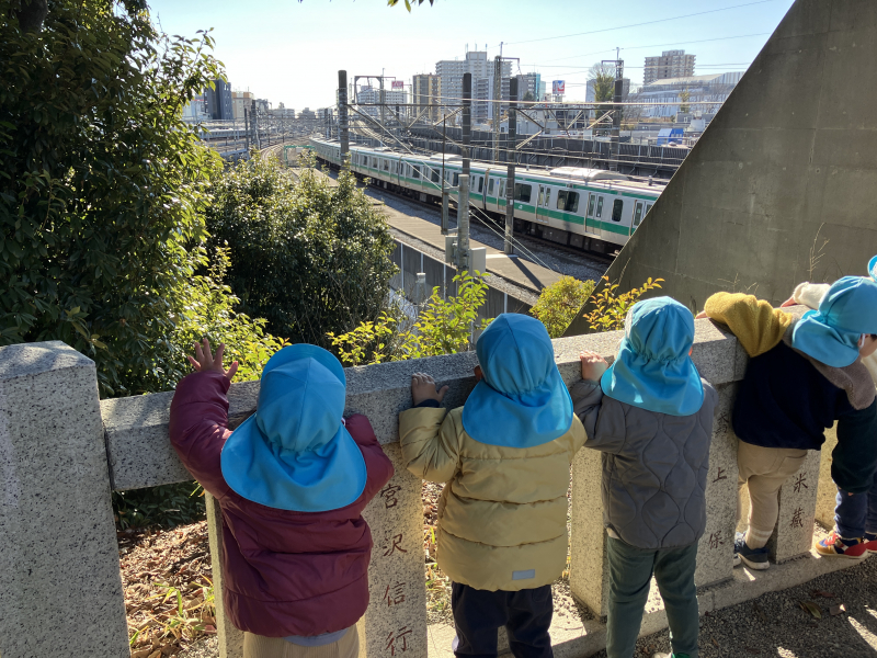 寒さに負けず、神社にお参りに行きました。「がんばれー!」と声をかけ合いながら急な坂道をのぼり、手を合わせて拝んだあとは線路の見える絶景ポイントへ行って電車が来るのを見ました。電車がくるたびに歓声を上げてよろこぶうさぎ組のお友だちでした。