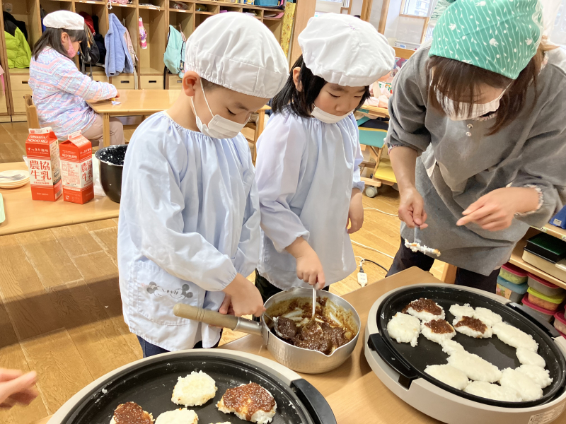昨年の冬に味噌作りをしており、1年近く熟成させて手作りの味噌が完成しました!そんな手作り味噌を使って五平餅のクッキングをしました。水分多めに炊いた白米をよくすりつぶし、味噌だれを塗ってこんがりと焼いていきます。室内に漂う香ばしい味噌の香り。「早く食べたい!」「いい匂いだなぁ~」と、ホットプレートを覗き込む子ども達。完成した五平餅は絶品で、大きなサイズでもぺろりと食べていました♪味噌作り、大成功です!五平餅だけではなく、給食の味噌汁にも使って味わっています。