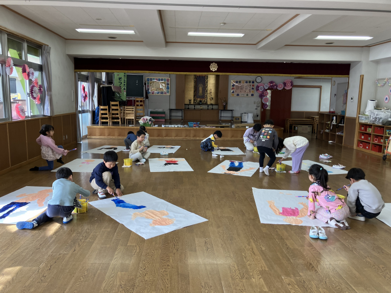 ひなまつりに向けて2月の後半に製作を行いました。お雛様とお内裏様の輪郭をハサミで切り取り、絵の具で髪の毛とお顔を描き、扇や笏などのパーツを貼り付けて製作を進めていきました。