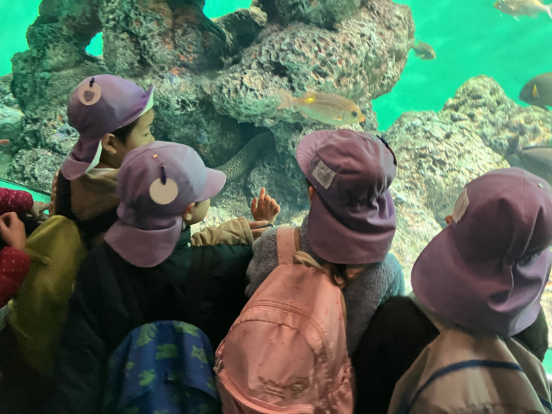 今年のお別れ遠足は葛西臨海水族園に行きました。こども達が行先を決め、わくわくと当日を迎えました。行きのバスの中ではみんなでカラオケ大会をして、大盛り上がり!到着後はすみれ組・たんぽぽ組の縦割り保育のグループに別れて少人数でゆっくりと水族園の中を探索しました。水槽の中には様々な海の生き物が!夢中になって覗き込むこども達。お弁当は海が見える広場で食べ、日本最大の観覧車にも乗って…と、素敵な思い出がたくさんできました♪
