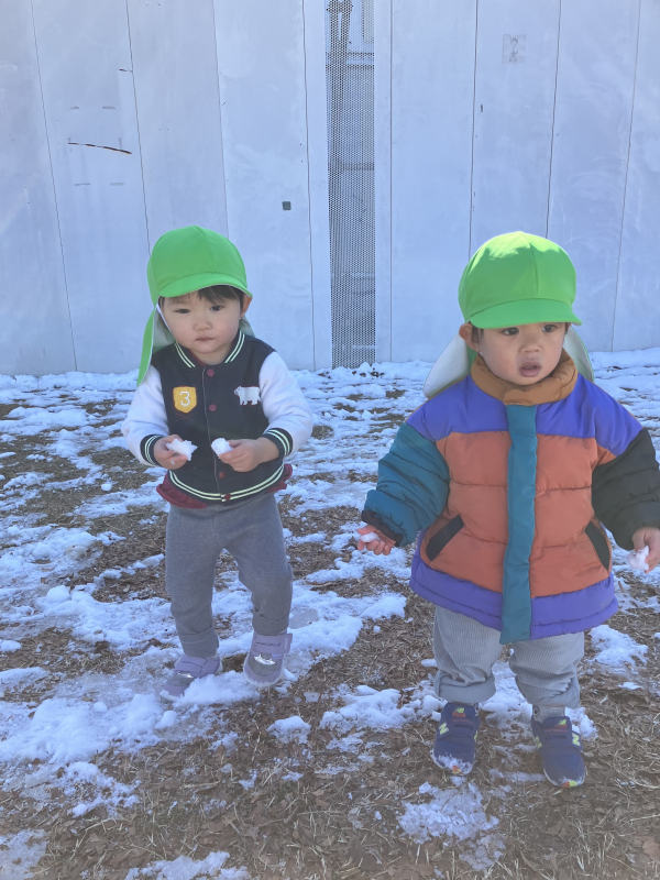 雪が降った日は興味深々でベランダから眺めていた子どもたちでしたが、翌日は天気が良かったので、近隣の公園に遊びに行って見ました。まだ日陰のところは雪が残っていたので、触ってみると冷たさを感じて手を引っ込める子もいましたが、小さいお団子を作ってあげると手に持って喜ぶ子もいました。靴で踏んでみたり…それぞれ冬の自然に触れることができました。来年の冬に雪だるまが作れるくらい降ったら一緒に作れるかなぁ。