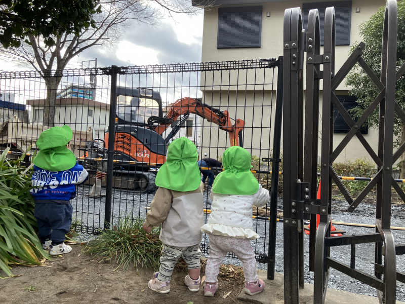 しばらくの間、参道で工事が行われていました。ガガガ…と大きな音にも驚いたりせず、園庭に出る度に柵越しから働く重機の様子に釘付けでした。「はたらくくるま」のうたも大好きでよく歌っていた時期だったのでタイムリーに見ることができてラッキーでした。時々指さして「やってるよ~」とこちらに教えてくれたりしてました。集中して眺める様子がなんともかわらしい後ろ姿です。