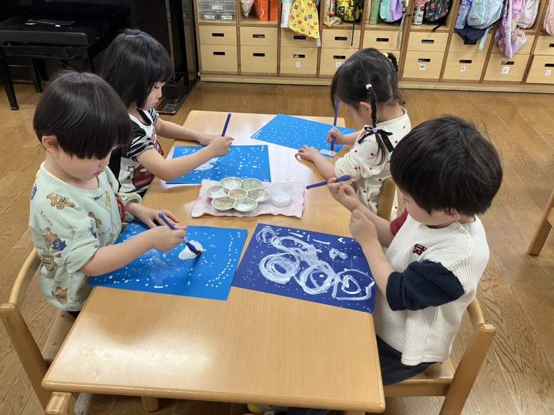 すみれ組の7月に行われるお泊り会。子ども達はほとんどの子が初めて保護者の方と離れてのお泊りにドキドキわくわく。皆で夕ご飯を食べて先生達からのお楽しみがあり、シャワーを浴びて寝ます。始まる前は不安が大きい子も帰る頃には楽しかった!とニコニコです。